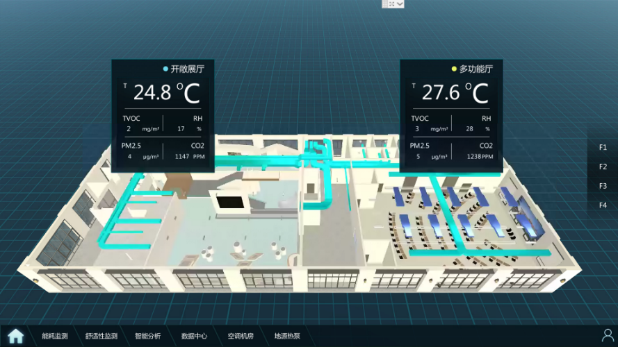 自主研制了多个建筑环境监测、人居行为检测和暖通设备调控等智能物联终端、研发了兼容多种物联通信协议并具备自主决策功能的边缘计算装置,设计并实现了云-边-端协同的模块化软件架构,基于”BIM+AIoT”技术,搭建智能建筑与低碳园区数字孪生智慧运维云平台,提供状态监测与高效节能整体化解决方案。
