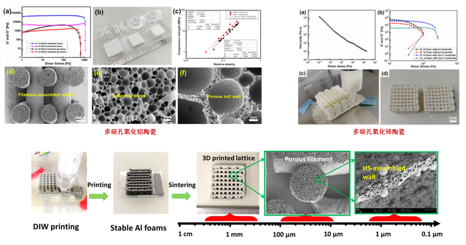 针对目前难以通过单一方式制备具有复杂形状、精细结构的多级孔陶瓷的现状,提出制备具有光敏特性的颗粒稳定乳液/泡沫,可用于光固化成型具有复杂形状的多级孔陶瓷,并将直写打印成型与(溶胶)颗粒稳定泡沫工艺相结合,获得了多级孔氧化铈、氧化铝陶瓷,使其在力学性能、比表面积等方面获得了显著的提升。