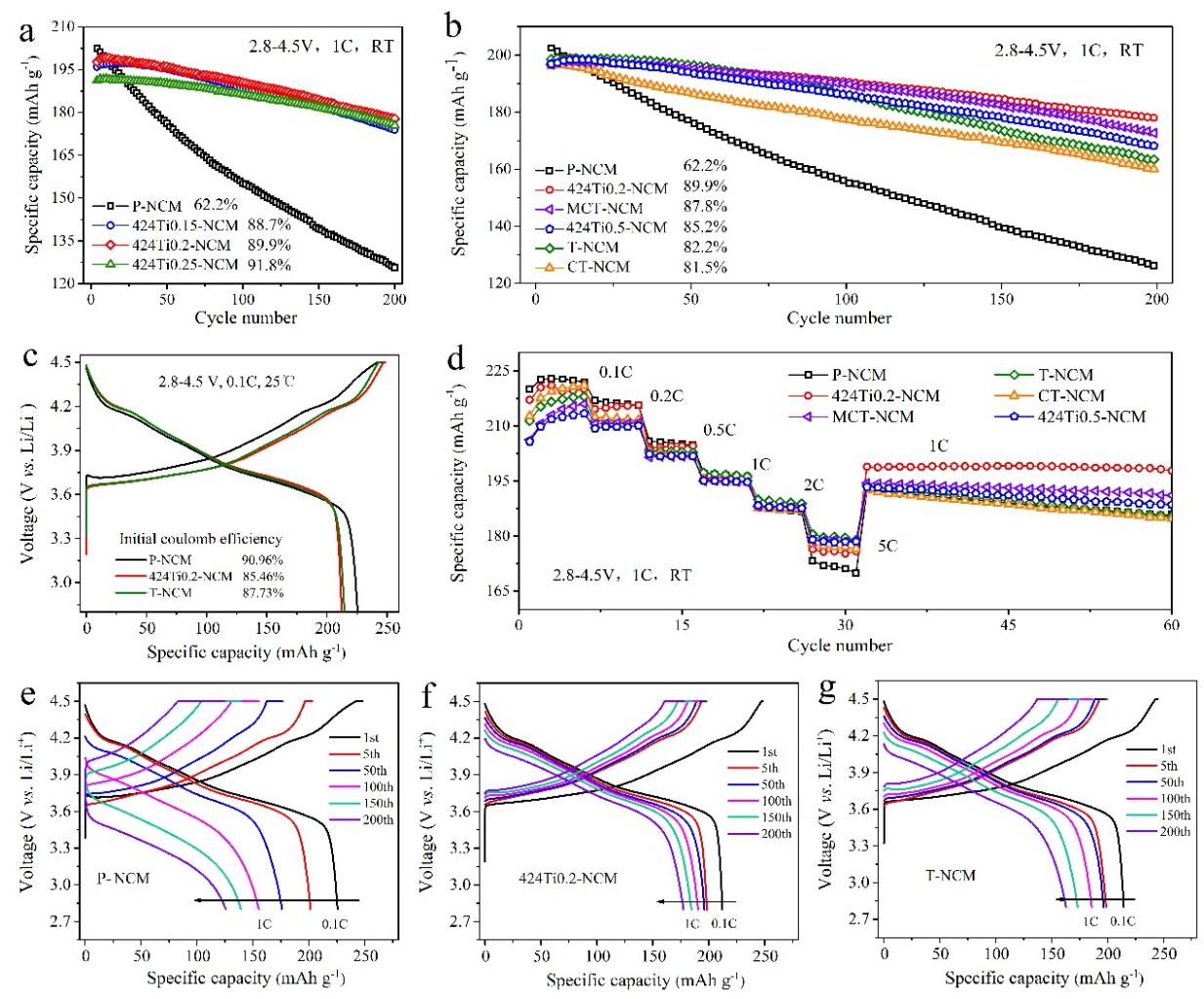 针对新能源动力类锂电池高镍三元正极材料NCM811,采用共沉淀方法进行Ti修饰,Ti主要分布在晶界和颗粒表面起到强化作用,实现了超高循环稳定性。该技术有望应用于动力电池领域,为新能源汽车“里程焦虑”问题提供有效解决途径。相关成果已发表在国际材料科学顶级期刊Small上(Small 2020, 16, 1906433)。
