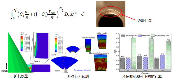 提出了一种面向先进高强钢的韧性断裂预测模型,考虑初始剪切损伤后,模型可以很好地预测边部开裂问题中裂纹的萌生和后续扩展,以及极限扩孔率。