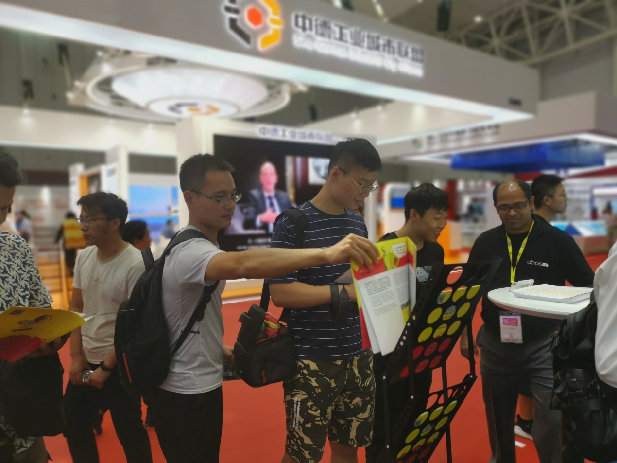 图为2号展馆德国abas展位,同学们在咨询企业ERP系统的应用优势