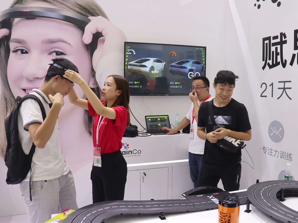图为2号展馆同学们体验脑电波感应设备