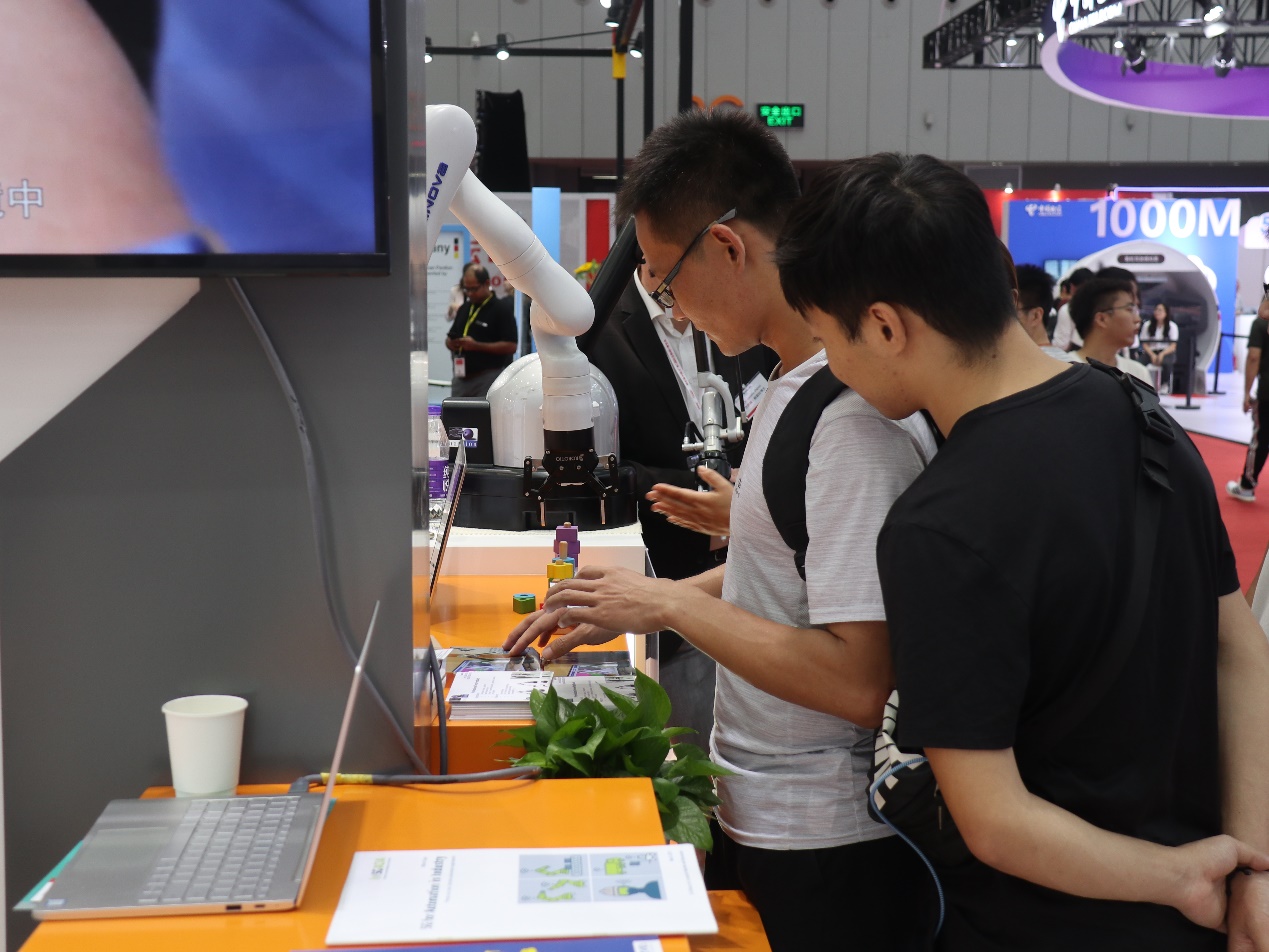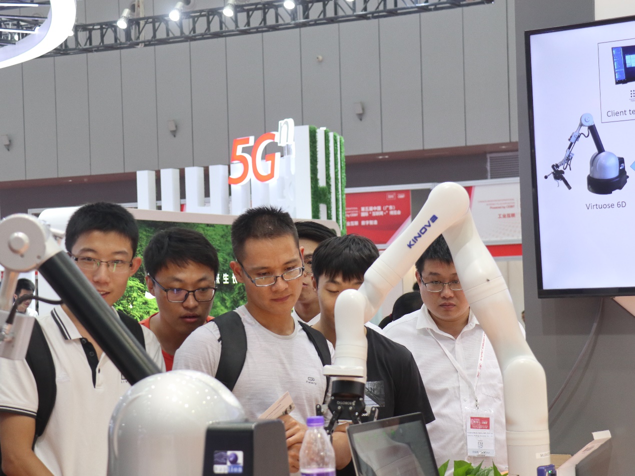 图为1号展馆同学们在观看工程师现场操作协同机器人