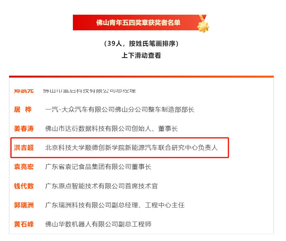 近日,经中共佛山市委批复,团市委、市青联开展了佛山青年五四奖章评比工作,共选出佛山“青年五四奖章”39人。ku真人 新能源汽车联合研究中心负责人洪吉超老师获此殊荣。