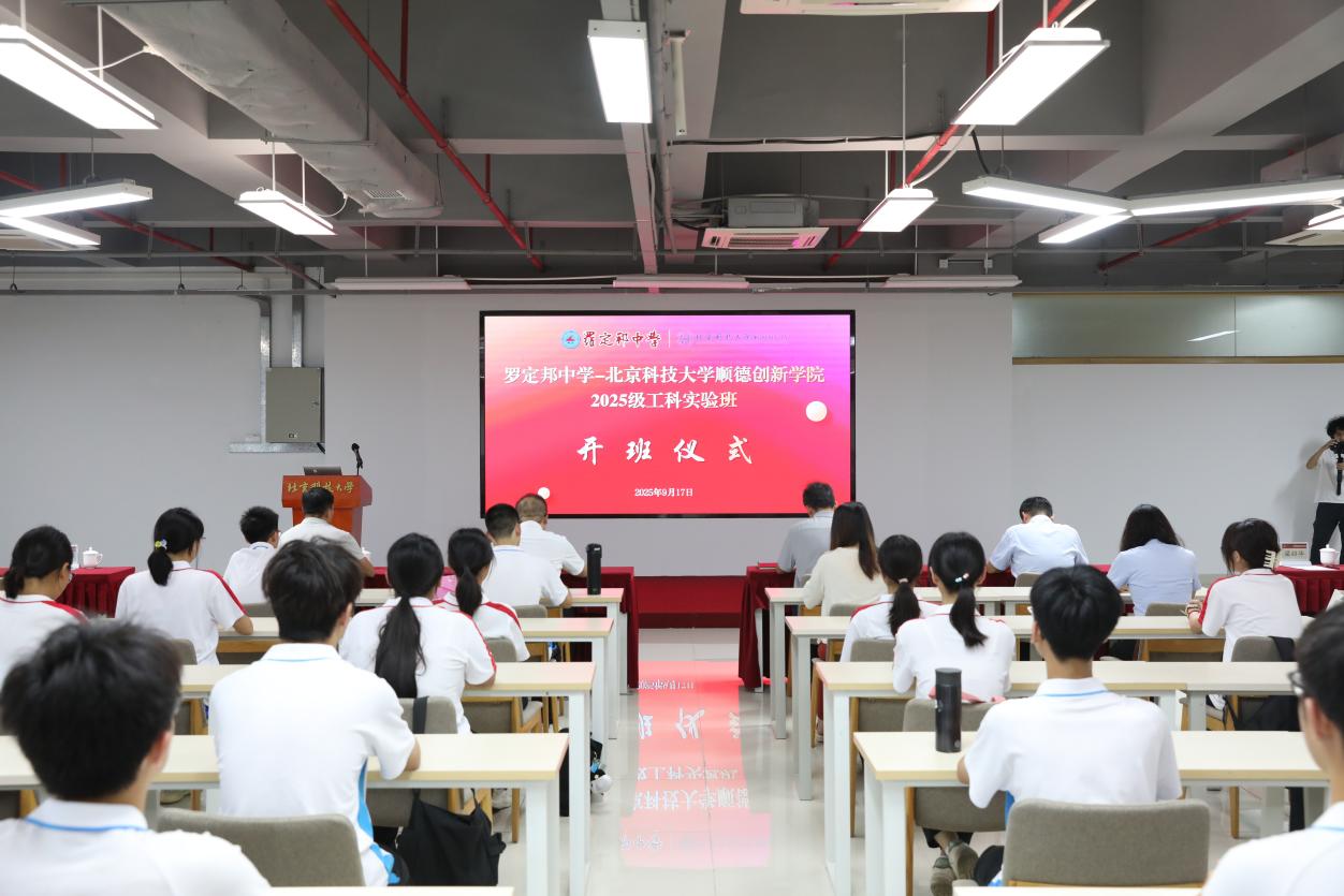在开班仪式上,北科大ku真人 党委书记郭东旭、顺德区罗定邦中学党委书记吴潜波分别致辞,两届工科实验班的学生代表分享了他们的期待与收获。北科大ku真人 副院长谭豪、科技发展部部长任显卓、科普科创中心副主任冯唯,罗定邦中学党政办公室主任郗坤洪、教研中心主任梁韶华、锦绣高一管委会主任张孝夷、锦绣高一级长田亚全、2025级工科实验班班主任徐洁琼,以及工科实验班的教师和家长代表等参加。
